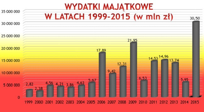 Dzięki dużemu zaangażowaniu środków pozabudżetowych udało się wykonać rekordowe inwestycje. Zachowaliśmy przy tym dobrą kondycję finansową powiatu nie dopuszczając do jego nadmiernego zadłużenia – podkreśla starosta. – Planowany deficyt na 2015 rok miał wynieść 9,6 mln zł (głównie za sprawą rozbudowy szpitala), ale dzięki prawidłowej polityce finansowej i oszczędnościom wprowadzonym przez zarząd powiatu zakończyliśmy ten rok z deficytem 4,9 mln złotych.