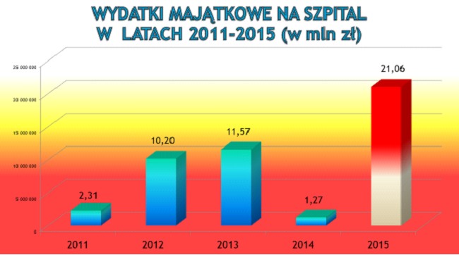 Według urzędników powiatu, 2016 upłynie na pewno pod znakiem kolejnych dużych inwestycji, na które zarezerwowano prawie 15,5 mln zł. 8,5 mln zł z tej kwoty przeznaczono na ostatni etap rozbudowy szpitala. Ponad 2 mln zł wydano zaraz na początku roku na wspomniane zakończenie robót budowlanych na IV i V kondygnacji, a kolejne 6 mln zł zarezerwowano na wyposażenie owych kondygnacji.