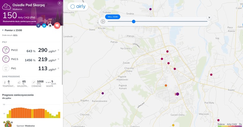 Czujniki Airly na osiedlu Pod Skarpą w Wadowicach od kilku dni wieczorami miedzy godz. 22 a północą wskazują przekroczone normy WHO dla pyłu PM10 600 procent, a dla rakotwórczego pyłu PM 2,5 1400 procent.