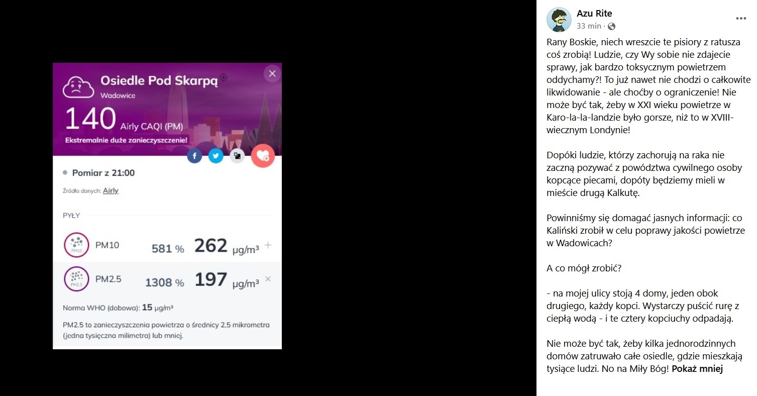Rany Boskie, niech wreszcie te pisiory z ratusza coś zrobią! Ludzie, czy Wy sobie nie zdajecie sprawy, jak bardzo toksycznym powietrzem oddychamy?! To już nawet nie chodzi o całkowite likwidowanie – ale choćby o ograniczenie! Nie może być tak, żeby w XXI wieku powietrze w Karo-la-la-landzie było gorsze, niż to w XVIII-wiecznym Londynie! Dopóki ludzie, którzy zachorują na raka nie zaczną pozywać z powództwa cywilnego osoby kopcące piecami, dopóty będziemy mieli w mieście drugą Kalkutę. Powinniśmy się domagać jasnych informacji: co Kaliński zrobił w celu poprawy jakości powietrze w Wadowicach? A co mógł zrobić? – na mojej ulicy stoją 4 domy, jeden obok drugiego, każdy kopci. Wystarczy puścić rurę z ciepłą wodą – i te cztery kopciuchy odpadają. Nie może być tak, żeby kilka jednorodzinnych domów zatruwało całe osiedle, gdzie mieszkają tysiące ludzi. No na Miły Bóg! – pisze na Facebooku joomla.wadowice24.promo-peak.ovh Azu Rite.
