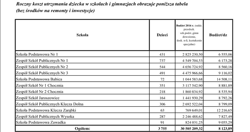 Okazuje się też, co jest bardzo ciekawe, że utrzymanie dziecka dla budżetu w każdej szkole kosztuje inną kwotę. Dla przykładu koszty edukacji dziecka w Zespole Szkół Publicznych nr 1 w Wadowicach wynoszą 6 173 zł rocznie, a w Szkole Podstawowej w Babicy 14 508 zł. Im mniejsza szkoła tym większy koszt.
