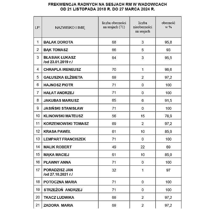 W zestawieniu udziału w posiedzeniach najsłabszą frekwencją wykazali się w tej kadencji radni opozycji z Klubu Wolne Wadowice: Robert Malik i Mateusz Klinowski oraz Paweł Krasa i Maciej Mąka.