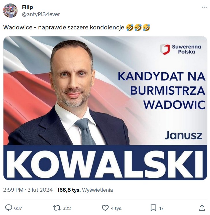 Kto uwierzył i dał się nabrać, to jego sprawa. W weekend sieć rozgrzała informacja, a właściwie grafika, na której poseł Janusz Kowalski prezentowany jest jako kandydat na burmistrza Wadowic.