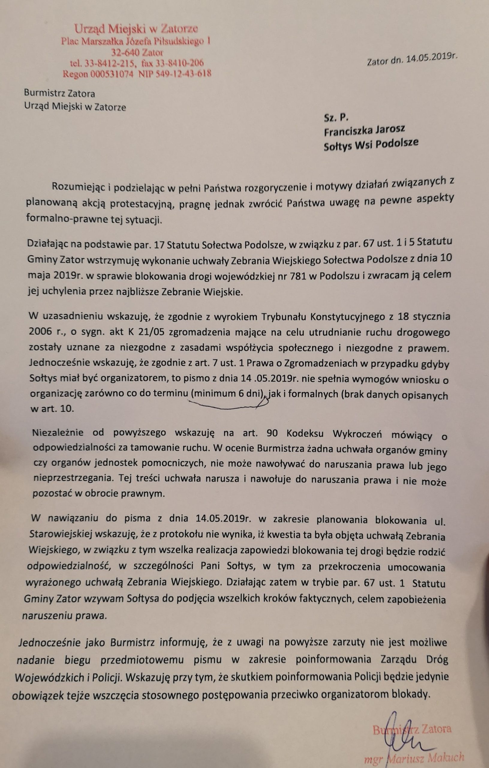 ZATOR – We wtorek (14.05) burmistrz Mariusz Makuch, przekazał organizatorom akcji protestacyjnej na Podolszu, czyli Radzie Sołeckiej pismo (TUTAJ). To odpowiedź na ich wniosek dotyczący blokady ul. Starowiejskiej w ciągu drogi wojewódzkiej nr 781.
