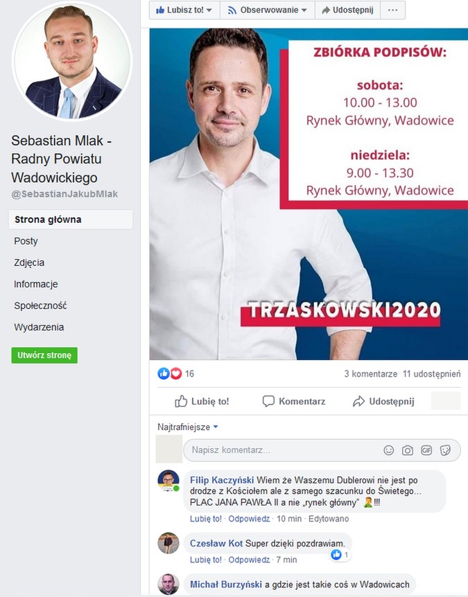 Przy okazji zaproszenia mieszkańców na zbiórkę podpisów poparcia dla kandydata Rafała Trzaskowskiego podał na plakacie, że akcja będzie miała miejsce na… „Rynku Głównym” w Wadowicach.