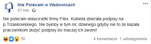 Jednocześnie w czwartek na Facebooku Internauci podają sobie informację z której wynika, że w jednej z wadowickich firm zbierano podpisy na Rafała Trzaskowskiego. Jak pisze informator właścicielka firmy „kazała pracownikom złożyć podpisy, bo inaczej ich zwolni”. Byłoby źle, gdyby tak miała wyglądać ta kampania.