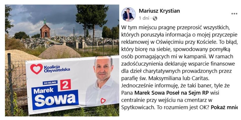 W tym miejscu pragnę przeprosić wszystkich, których poruszyła informacja o mojej przyczepie reklamowej w Oświęcimiu przy Kościele. To błąd, który biorę na siebie, spowodowany pomyłką osób pomagających mi w kampanii. W ramach zadośćuczynienia deklaruję wsparcie finansowe dla dzieł charytatywnych prowadzonych przez parafię św. Maksymiliana lub Caritas – napisał Mariusz Krystian.