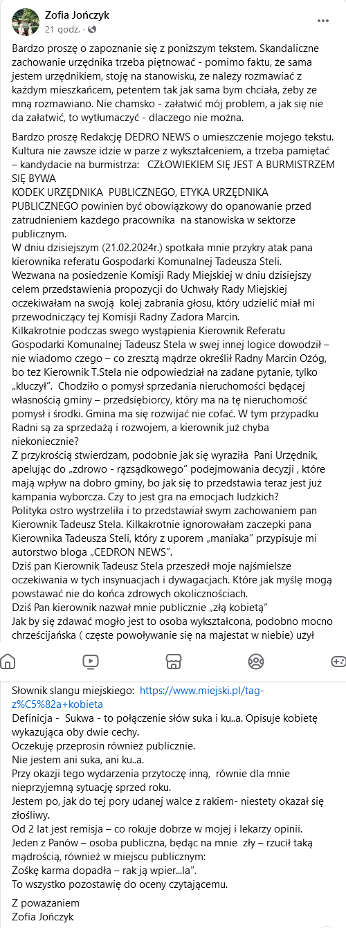W dniu dzisiejszym (21.02.2024r.) spotkała mnie przykry atak pana kierownika referatu Gospodarki Komunalnej Tadeusza Steli. Dziś pan Kierownik Tadeusz Stela przeszedł moje najśmielsze oczekiwania w tych insynuacjach i dywagacjach. Które jak myślę mogą powstawać nie do końca zdrowych okolicznościach. Dziś Pan kierownik nazwał mnie publicznie „złą kobietą” – czytamy we wpisie na Facebooku.