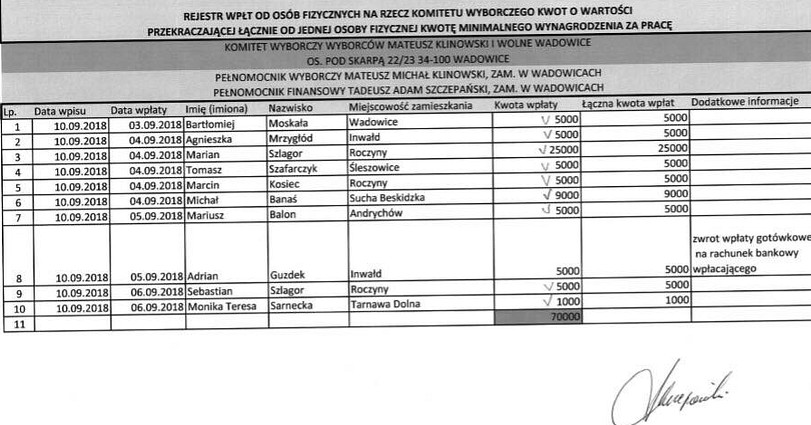 Na kampanię komitetu Klinowskiego pieniądze wpłaciło 10 osób. Poza jednym wyjątkiem sponsorzy nie był mieszkańcami gminy Wadowice, ale głównie gminy Andrychów.