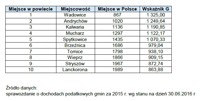 W tym roku, na postawie danych z 2015 roku, przygotowano ranking najbogatszych i najbiedniejszych gmin. Swoje dane udostępniły także samorządy powiatu wadowickiego.