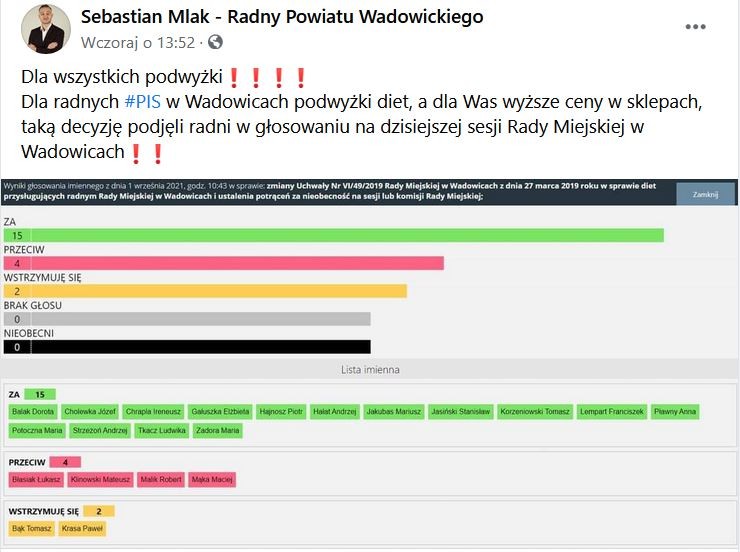 Dla wszystkich podwyżki !!!! Dla radnych #PIS w Wadowicach podwyżki diet, a dla Was wyższe ceny w sklepach, taką decyzję podjęli radni w głosowaniu na dzisiejszej sesji Rady Miejskiej w Wadowicach – grzmi radny na Facebooku.