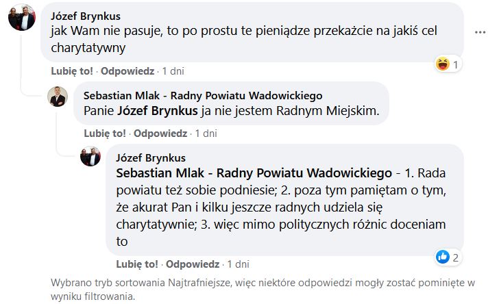 Do gorącej dyskusji pod postem radnego KO włączył się były poseł z Wadowic Józef Brynkus.