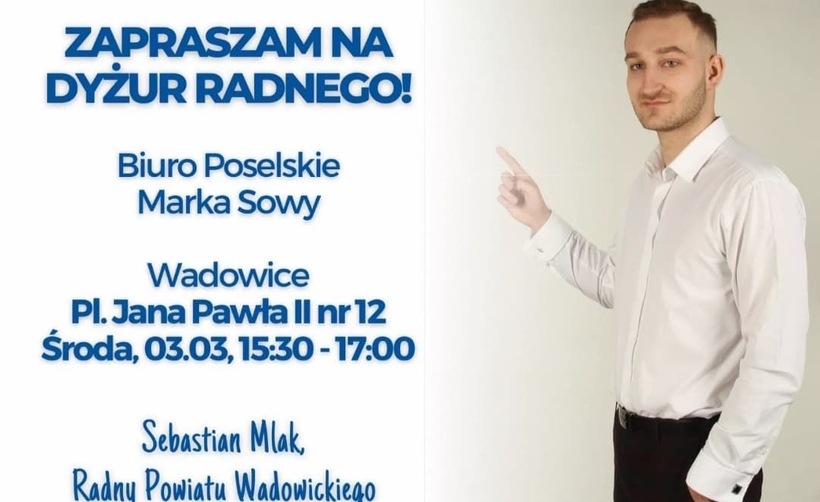 Radny powiatowy Sebastian Mlak z Wadowic, uznawany za lidera lokalnej opozycji, ma nowy pomysł na to, by być bliżej mieszkańców. Chce z nimi rozmawiać podczas dyżurów. Kiedy?