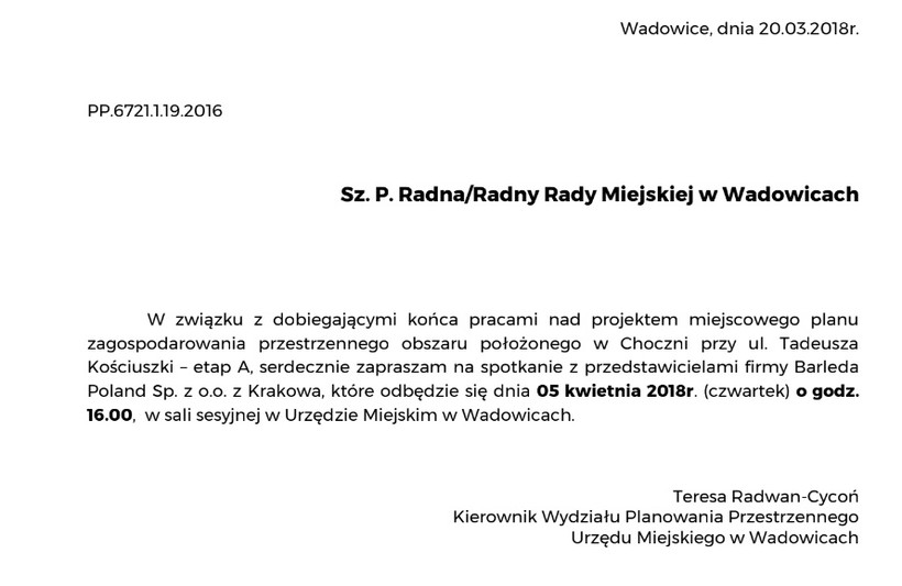 W czwartek (5.04) urzędnicy burmistrza Mateusza Klinowskiego zwołali po godzinach pracy w ratuszu tajne spotkanie z radnymi i biznesmenami, którzy chcą przekształcić 22 hektary pól rolnych na tereny pod handel wielkopowierzchniowy. Spotkanie miało się odbyć w sali sesyjnej Rady Miejskiej. Zaproszenie na obrady dostali wszyscy radni.