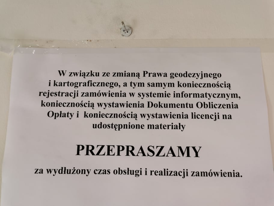 W związku ze zmiana prawa geodezyjnego i kartograficznego, a tym samym koniecznością rejestracji zamówienia w systemie informatycznym, koniecznością wystawienia Dokumentu Obliczenia Opłaty i koniecznością licencji na udostępnione materiały PRZEPRASZAMY za wydłużony czas obsługi i realizacji zamówienia – czytamy na kartce z komunikatem wywieszonym na drzwiach biura w starostwie w Wadowicach.