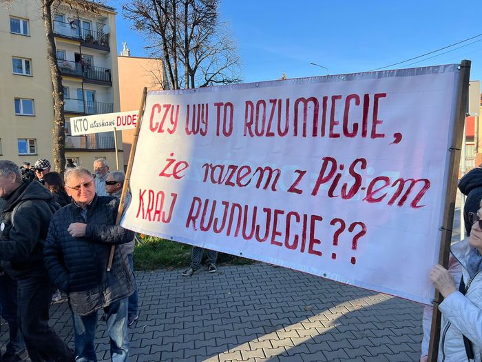 Podczas wizyty prezesa Jarosława Kaczyńskiego w Wadowicach protestujący zgromadzili się pod Wadowickim Centrum Kultury, by wyrazić swój sprzeciw wobec polityki partii rządzącej.