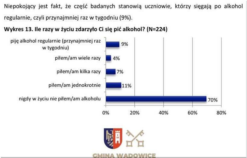 Jednakże 11 procent piło alkohol jednokrotnie, 7 procent piło kilka razy, 4 procent wiele razy, a 9 procent nastolatków w Wadowicach w wieku do 15 lat  przyznaje się, że pije alkohol regularnie raz w tygodniu.
