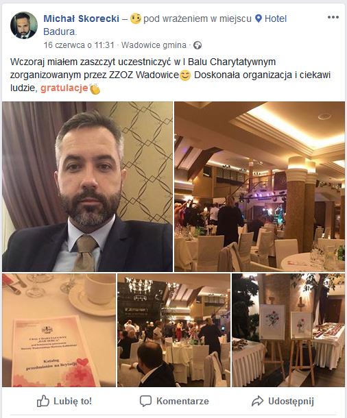 Miałem zaszczyt uczestniczyć w I Balu Charytatywnym zorganizowanym przez ZZOZ Wadowice. Doskonała organizacja i ciekawi ludzie, gratulacje – napisał na Facebooku Michał Skorecki.