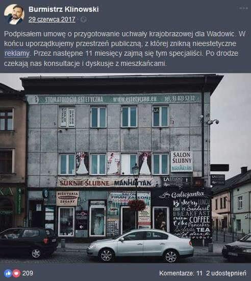 Po czterech latach jego rządów w Wadowicach uchwała krajobrazowa została tylko na papierze (TUTAJ). Zamiast tego na najbardziej obwieszonej reklamami kamienicy, którą sam pokazywał jako negatywny przykład, wisi dziś na wielkim banerze facjata burmistrza.