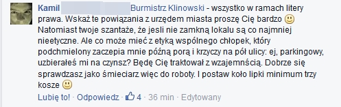 Klinowski do zarzutów się nie odniósł. Zamiast tego niewygodny dla siebie komentarz burmistrz szybko z Facebooka usunął. Autor przykleił do siebie na profil i jego treść krąży teraz w sieci społecznościowej. Są też inne treści, które dodają Internauci.