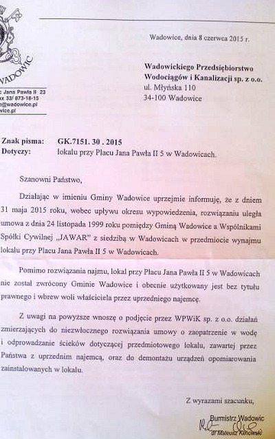 Tymczasem portal joomla.wadowice24.promo-peak.ovh dotarł do korespondencji burmistrza Mateusza Klinowskiego, który kilka dni temu (8.06) wysłał do prezesa WPWiK Andrzeja Smagi wezwanie do „natychmiastowego” wypowiedzenia umowy z firmą Jawar na dostarczenie wody i odprowadzanie ścieków z restauracji oraz demontażu urządzeń pomiarowych. Po tym piśmie prezes WPWiK wystąpił do spółki z informacją, że dojdzie do wizyty jego przedstawicieli restauracji Aromat Cafe.