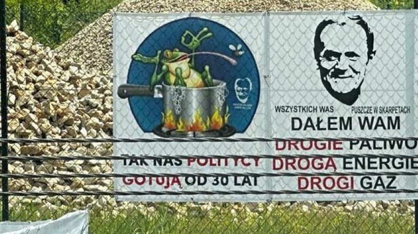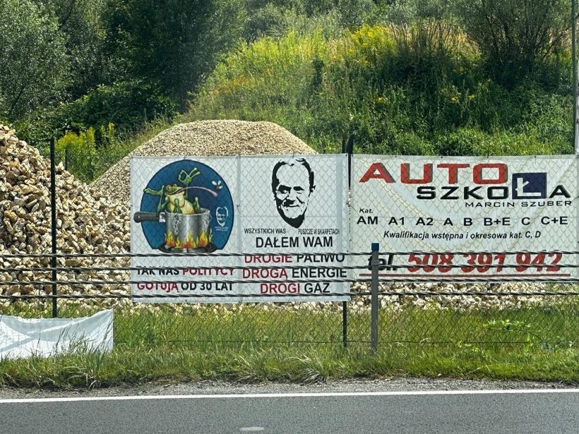 Na banerze pojawiła się podobizna premiera Polski Donalda Tuska z prowokacyjnymi treściami. „Wszystkich Was puszczę w skarpetkach” – czytamy, a także: „Dałem Wam drogie paliwo, drogą energię, drogi gaz” .