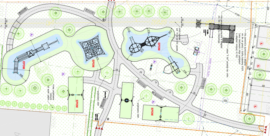 Elementy wyposażenia placu zaprojektowano z bezpiecznych i trwałych materiałów naturalnych. Wszystkie elementy zostaną zamontowane z zachowaniem stref bezpieczeństwa. Ścieżki komunikacyjne zostaną wykonane z kostki brukowej.