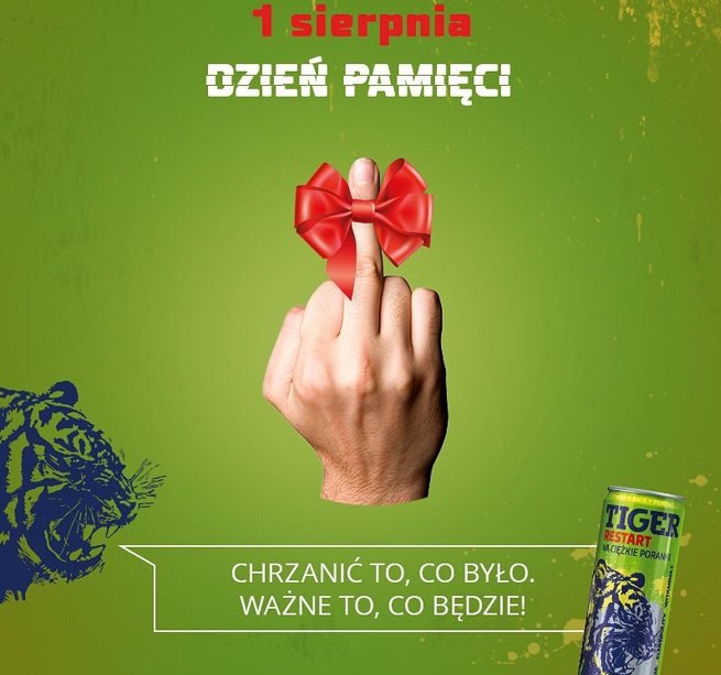 Przypomnijmy, że 1 sierpnia, w Narodowy Dzień Pamięci Powstania Warszawskiego, na profilu marki Tiger w serwisie Instagram umieszczona została grafika z wyciągniętym środkowym palcem i napisem „Chrzanić to, co było. Ważne to, co będzie!”. Obok napisu umieszczona została puszka napoju Tiger. Grafika wywołała lawinę negatywnych komentarzy w internecie.
