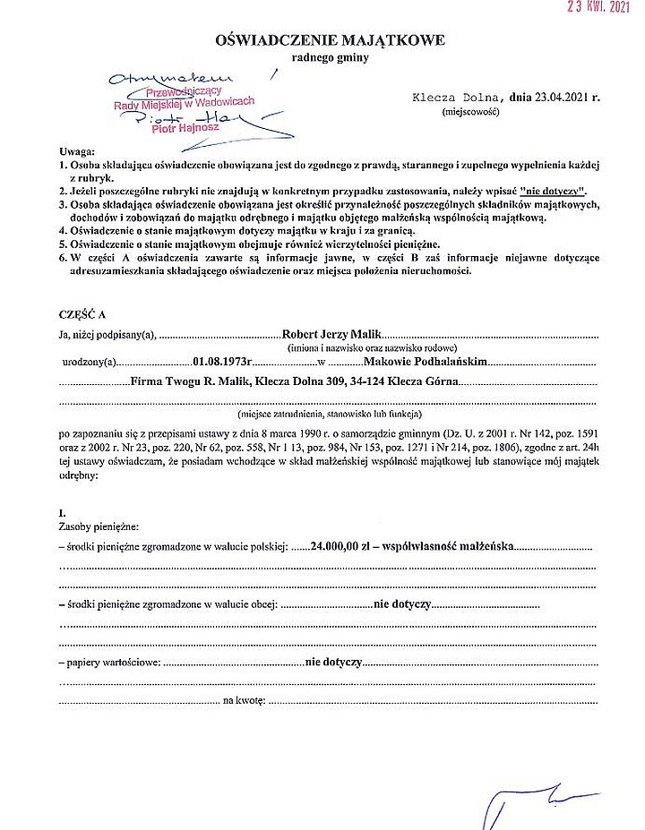 :: Oświadczenie majątkowe radnego Roberta Malika