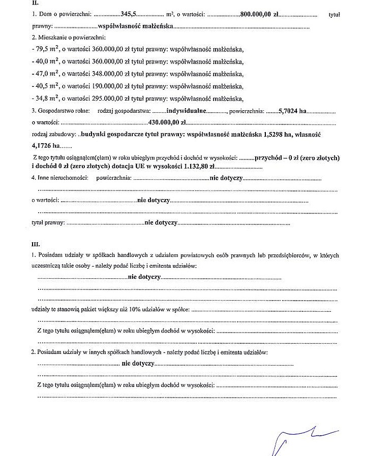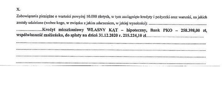 Inną sprawa niż sam udział w przetargu jest wylicytowana kwota 1,23 mln zł. I tu też pojawia się szereg pytań mieszkańców, którzy piszą do nas. Skąd radny ma na to pieniądze, skoro 23 kwietnia 2021 roku wypełniając oświadczenie majątkowe wpisał, że na koncie bankowym ma 24 tysiące złotych i jednocześnie 215 tysięcy złotych kredytu do spłaty.