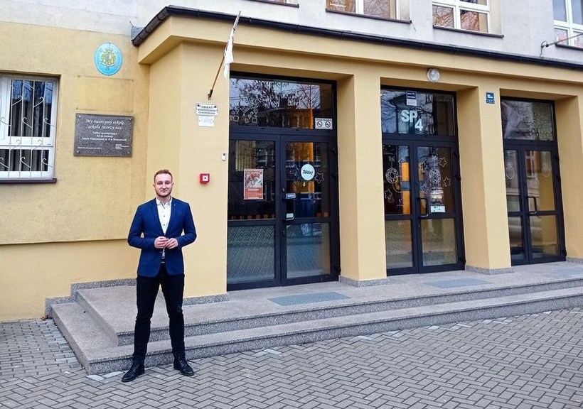 Szkoła Podstawowa nr 4 w Wadowicach. To tutaj wydawane są obiady dla uczniów i nauczycieli. Ich cena ostatnio wzrosła. Radny Sebastian Mlak sprawdza, jak bardzo ceny poszły do góry.