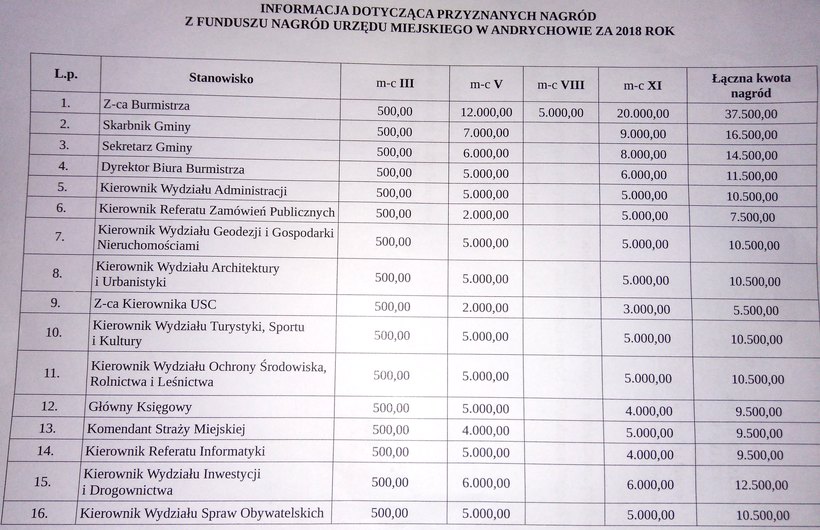 Wykaz nagród dla pracowników Urzędu Miasta w Andrychowie za 2018 rok ( Fot. Jakub Guzdek, radny)