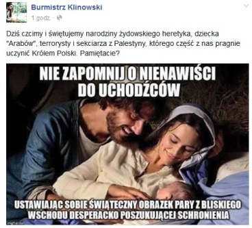 Dziś czcimy i świętujemy narodziny żydowskiego heretyka, dziecka Arabów, terrorysty i sekciarza z Palestyny, którego część z nas pragnie uczynić Królem Polski. Pamiętacie? – napisał wówczas burmistrz Klinowski.