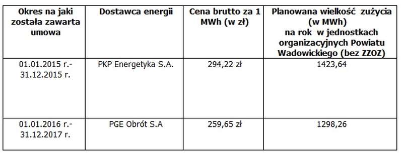 Cena za 1 MWh energii elektrycznej, jaką uzyskano po przeprowadzeniu przetargu, wyniosła 259,65 złotych brutto, czyli o 35 złotych mniej w porównaniu do ubiegłorocznej umowy Powiatu Wadowickiego z poprzednim dostawcą – PKP Energetyka S.A..