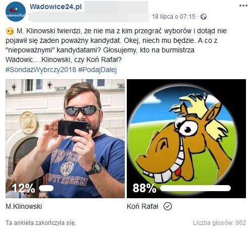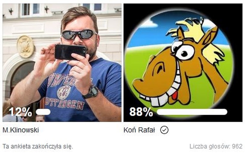Gdyby wybory odbyły się w takiej konfiguracji, to Koń Rafał zmiażdżyłby Klinowskiego. Na Konia Rafała głosowałoby 88 procent ankietowanych, na Klinowskiego  12 procent. Ankietę przeprowadzono na oficjalnym profilu Facebook.pl Wadowice4.pl w dniach od 18 do 25 lipca.
