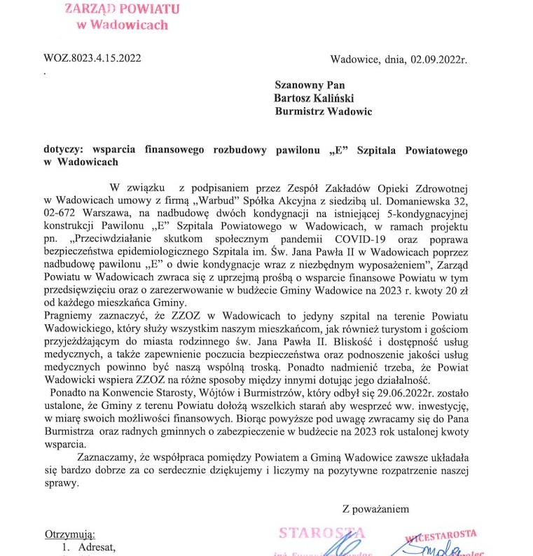 Zarząd Powiatu w Wadowicach zwraca się z uprzejmą prośbą o wsparcie finansowe Powiatu w tym przedsięwzięciu oraz o zarezerwowanie w budżecie Gminy Wadowice na 2023 r. kwoty 20 zł od każdego mieszkańca Gminy. Pragniemy zaznaczyć, że ZZOZ w Wadowicach to jedyny szpital na terenie Powiatu Wadowickiego, który służy wszystkim naszym mieszkańcom, jak również turystom i gościom przyjeżdżającym do miasta rodzinnego św. Jana Pawła II. Bliskość i dostępność usług medycznych powinno być naszą wspólną troską – pisze starosta Eugeniusz Kurdas do burmistrza Wadowic.