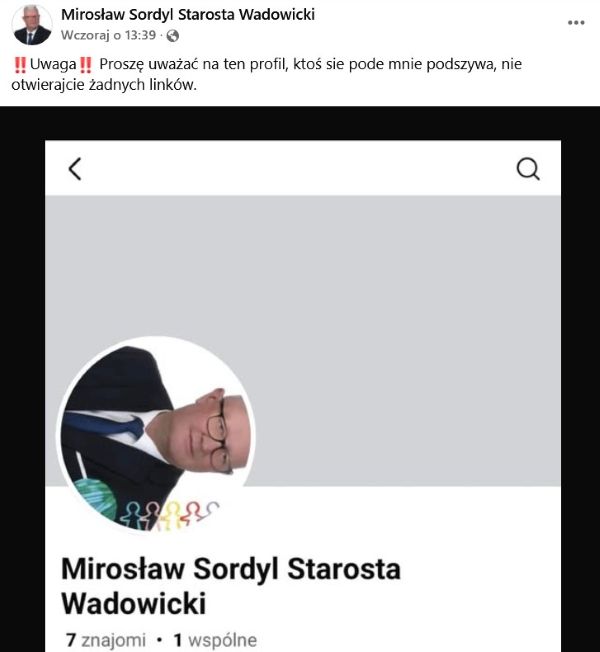 Profil „Mirosław Sordyl Starosta Wadowicki” z odwróconym zdjęciem starosty ma być fałszywy, a sam zainteresowany nie wie, kto go założył. Profil nie zawiera żadnych treści, ale starosta podejrzewa, że służy do wyłudzenia danych. Stąd też jego ostrzeżenie.