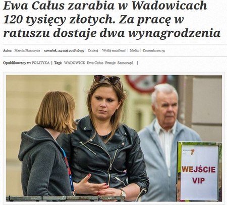 Z kolei Ewa Całus, która przyszła do Wadowic razem z Klinowskim, otrzymała nie tylko etat wiceburmistrza, ale również przewodniczenie komisji rozwiązywania problemów alkoholowych, za co pobierała dodatkowe dochody. Sekretarzem tej komisji jest Karolina Czyżowicz, która również przyszła do pracy z Krakowa.