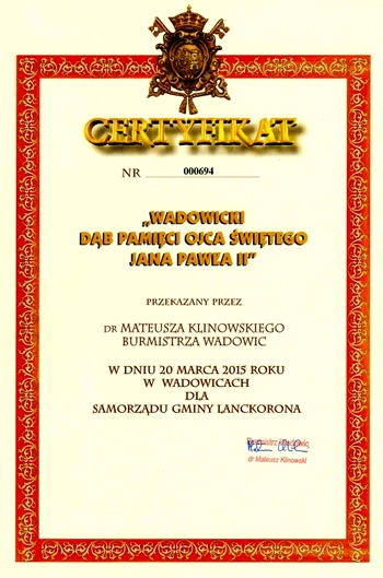 W Lanckoronie, w 10. rocznicę śmierci św. Jana Pawła II, posadzą Dąb Papieski. Będzie to drugie drzewko upamiętniające Papieża Polaka w tej miejscowości. Pierwsze posadziła w 2006 roku Zofia Oszacka, ówczesna wójt. Tym razem jednak, drzewko jest „certyfikowane” przez samego burmistrza Wadowic.