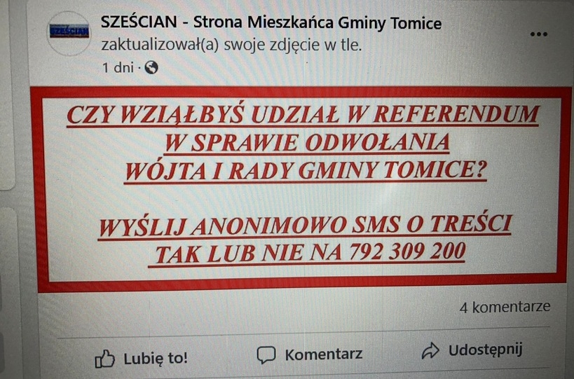 Na tym jednak nie koniec. W ostatnich godzinach Rafał Kwarciak poszedł dalej i odsłonił karty. O ile dotąd informował i krytykował wójta, to teraz chce rzucić mu rękawicę. Sześcian zorganizował esemesową akcję zbierania odpowiedzi na pytanie, czy poszedłbyś na referendum w sprawie odwołania wójta i Rady Gminy.