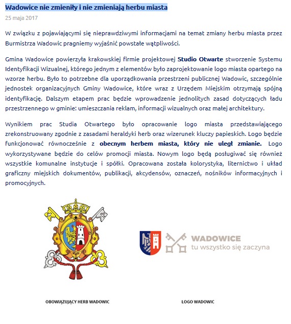 Po medialnej burzy w sprawie zmiany herbu burmistrz Mateusz Klinowski i jego wydział promocji pod rządami Janusza Gawrona postanowili sami sobie zaprzeczyć. „Wadowice nie zmieniają herbu” – oświadczyli dziś. Naprawdę?