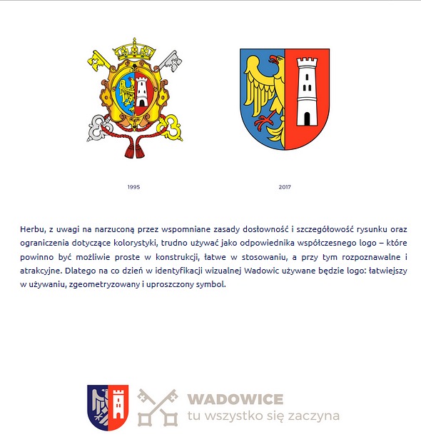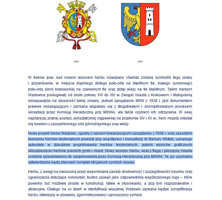 Nowy projekt herbu Wadowic, zgodny z opisem towarzyszącym zarządzeniu z 1938 r. oraz zasadami tworzenia herbów terytorialnych powstał przy współpracy i konsultacji dr Barbary Widłak, uznanego autorytetu w dziedzinie projektowania herbów terytorialnych, autorki wzorców graficznych kilkudziesięciu herbów polskich gmin i miast. Nowy wzorzec herbu, wraz z flagą i pieczęcią miasta zostanie przedstawiony do zaopiniowania przez Komisję Heraldyczną przy MSWiA. Te, po uzyskaniu zatwierdzenia będą stanowić komplet oficjalnych symboli miasta – pisali jeszcze dwa tygodni temu Klinowski z Gawronem.
