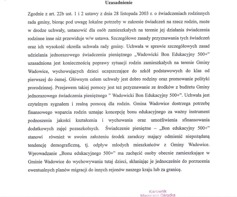 Wprowadzenie „Bonu edukacyjnego 500+” ma zachęcić osoby obecnie zamieszkujące w Gminie Wadowice do wychowywania tutaj dzieci, skłaniając je jednocześnie do porzucenia ewentualnych planów migracji do innych rejonów naszego kraju lub za granicę – czytamy w uzasadnieniu uchwały burmistrza Bartosza Kalińskiego.