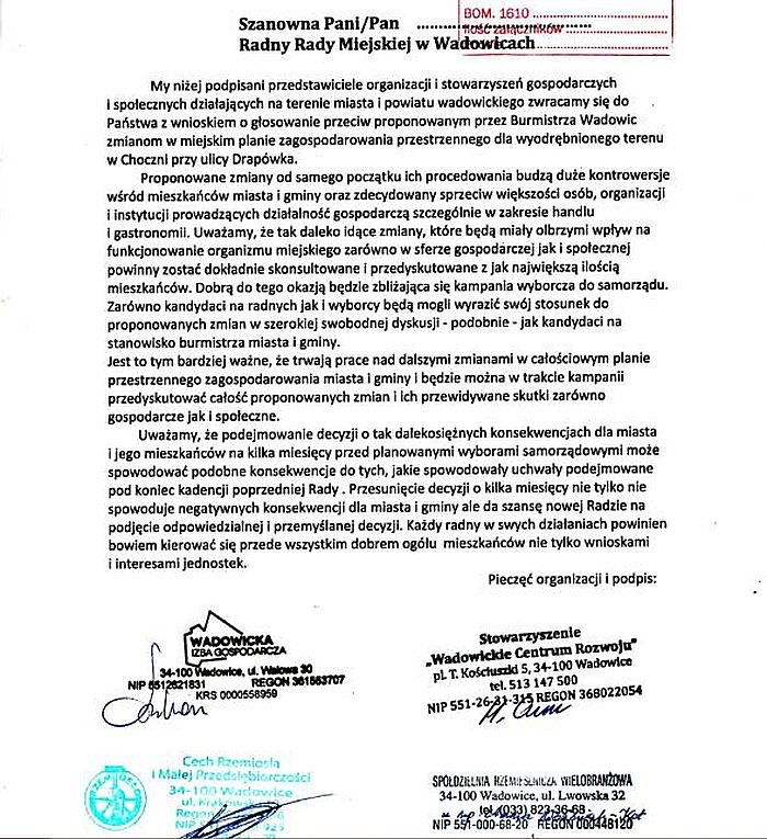 Apel do radnych podpisały cztery organizacje Wadowicka Izba Gospodarcza, Stowarzyszenie Wadowickie Centrum rozwoju, Cech Rzemiosła i Małej Przedsiębiorczości oraz Spółdzielnia Rzemieślnicza Wielobranżowa.