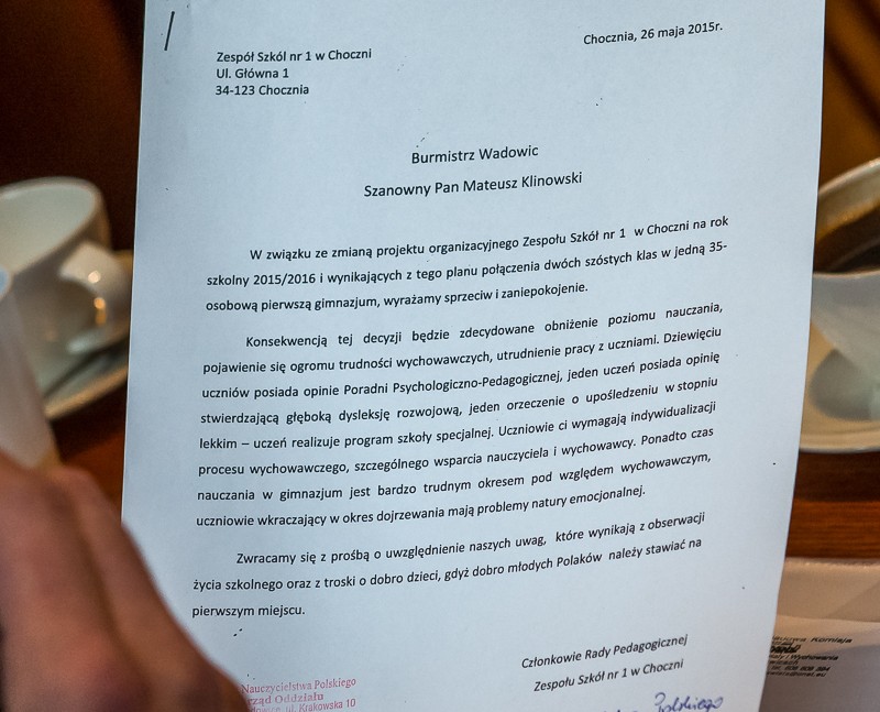 Na sesji Rady Miasta radny Tomasz Bąk (Nowoczesny Samorząd) wystąpił z interpelacją, w której pytał burmistrza, dlaczego od września w Gimnazjum nr 1 w Choczni będzie tylko jedna klasa pierwsza z 35 uczniami.