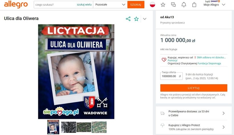 Jak się dowiadujemy pomysłodawcą akcji „ulica dla Oliwiera” jest Dawid Brusik z Wadowic, który kilka tygodni temu zorganizował zlot morsów, podczas którego zbierano pieniądze na leczenie chorego na SMA Oliwiera. Teraz założył licytację w popularnym serwisie Allegro (TUTAJ link).