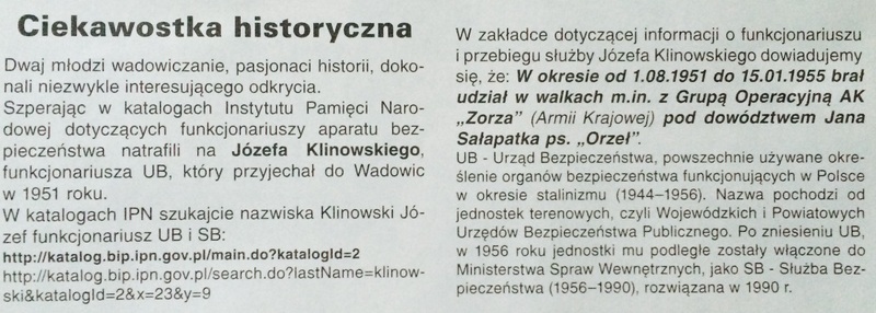 Szperając w katalogach Instytutu Pamięci Narodowej dotyczących funkcjonariuszy aparatu bezpieczeństwa natrafili na Józefa Klinowskiego, funkcjonariusza UB, który przyjechał do Wadowic w 1951 roku. W katalogach IPN szukajcie nazwiska Klinowski Józef funkcjonariusz UB i SB. W zakładce dotyczącej informacji o funkcjonariuszu o przebiegu służy Józefa Klinowskiego dowiadujemy się że w okresie od 1.08.1951 do 15.01.1955 brał udział w walkach m.in. z Grupą Operacyjną AK „Zorza” (Armii Krajowej) pod dowództwem Jana Sałapatka ps. „Orzeł – piszą autorzy ulotki.