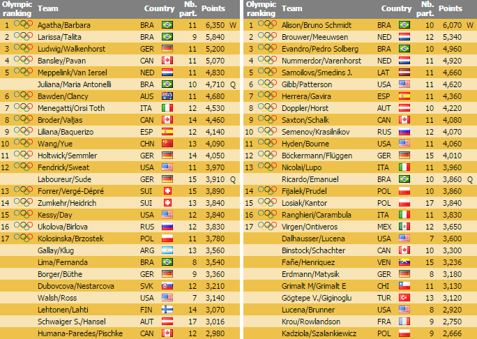 W Igrzyskach Olimpijskich w Rio de Janeiro zagrają w sumie dwadzieścia cztery pary kobiet i tyle samo duetów męskich. Szesnaście drużyn (zarówno męskich jak i damskich) wyłoni specjalny ranking olimpijski, który bierze pod uwagę starty podczas międzynarodowych turniejów w terminie od stycznia 2015 roku do czerwca br. W tej chwili podopieczne Łukasza Fijałka, czyli para Kołosińska/Brzostek zajmują 17 miejsce w rankingu, ale znajdują się na miejscu premiowanym awansem, ponieważ na wyższym miejscach plasują się po trzy reprezentacje Niemiec oraz Brazylii, a na Olimpiadę mogą jechać maksymalnie dwa zespoły z jednego kraju. Na pozycji premiowanej awansem jest również para Fijałek/Prudel, która w męskim rankingu zajmuje 14 miejsce.