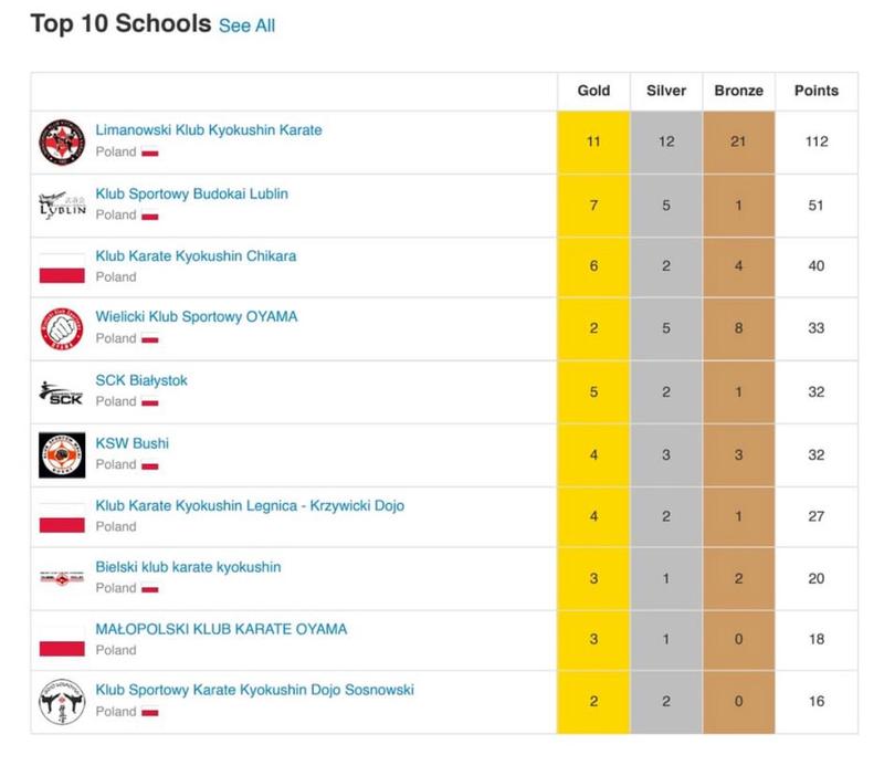 Małopolski Klub Karate Oyama Kasperek Team zajął dziewiąte miejsce drużynowo wśród 60 klubów startujących w turnieju.