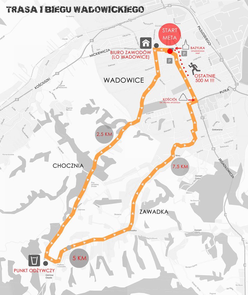 Zapisy na bieg przyjmowane będą już tylko i wyłącznie w biurze zawodów, jedynie w przypadku nie wyczerpania limitu 500 miejsc startujących. Pakiet startowy wynosi w tej chwili 60 złotych. Trasa Biegu Wadowickiego rozpoczynać i kończyć będzie się na rynku w Wadowicach, skąd biegacze wyruszą w stronę Choczni ulicą Karmelicką, następnie przez Zawadkę oraz ulicę Niwy, i pobiegną z powrotem do centrum aleją Matki Bożej Fatimskiej.
